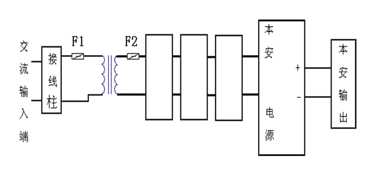 交流電源經(jīng)由變壓器降壓后經(jīng)整流、濾波及穩(wěn)壓等環(huán)節(jié),輸出穩(wěn)定的直流電壓。