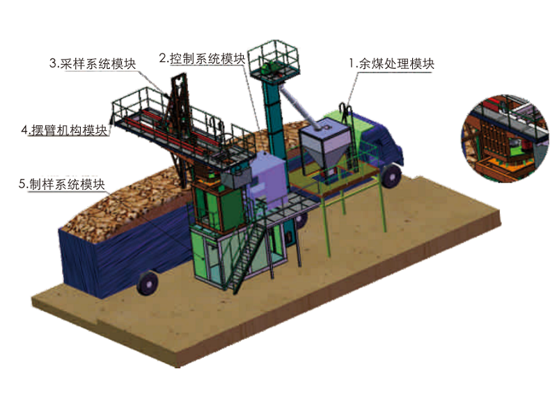 汽車采制樣系統(tǒng)主要由采樣部分、破碎部分、縮分部分、樣品收集部分和余煤返排部分等組成。當(dāng)運(yùn)煤車按要求入場(chǎng)定位后,采樣頭在電氣控制設(shè)備的控制下,先到達(dá)采樣位置進(jìn)行原始樣料的采集;采樣完成后,擺臂旋轉(zhuǎn)到排料位置,將所采煤樣卸到制樣機(jī)一側(cè)的接料斗內(nèi),送入制樣系統(tǒng);經(jīng)破碎機(jī)破碎后再進(jìn)入縮分器,按要求的縮分比進(jìn)行縮分,縮分后的留樣和棄樣被分別送到集樣器和棄樣收集裝置,完成一次采制樣。 1、高度自動(dòng)化